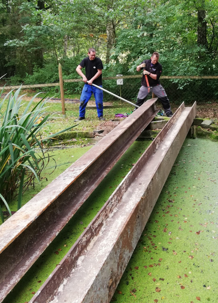Bei bestem Arbeitswetter trafen sich 25 junge und alte Menschen, um mit ihren verschiedenen Fähigkeiten und Leidenschaften in zahlreichen Projekten das Forsthaus Stück für Stück ein bisschen schöner zu machen: mit einem neuen Steg über dem „Forschungsteich“, einem Regenwassersammel- und -verteilungssystem, der erweiterten Balancierstrecke oder reparierten Tastkästen, Bänken und Tischen.