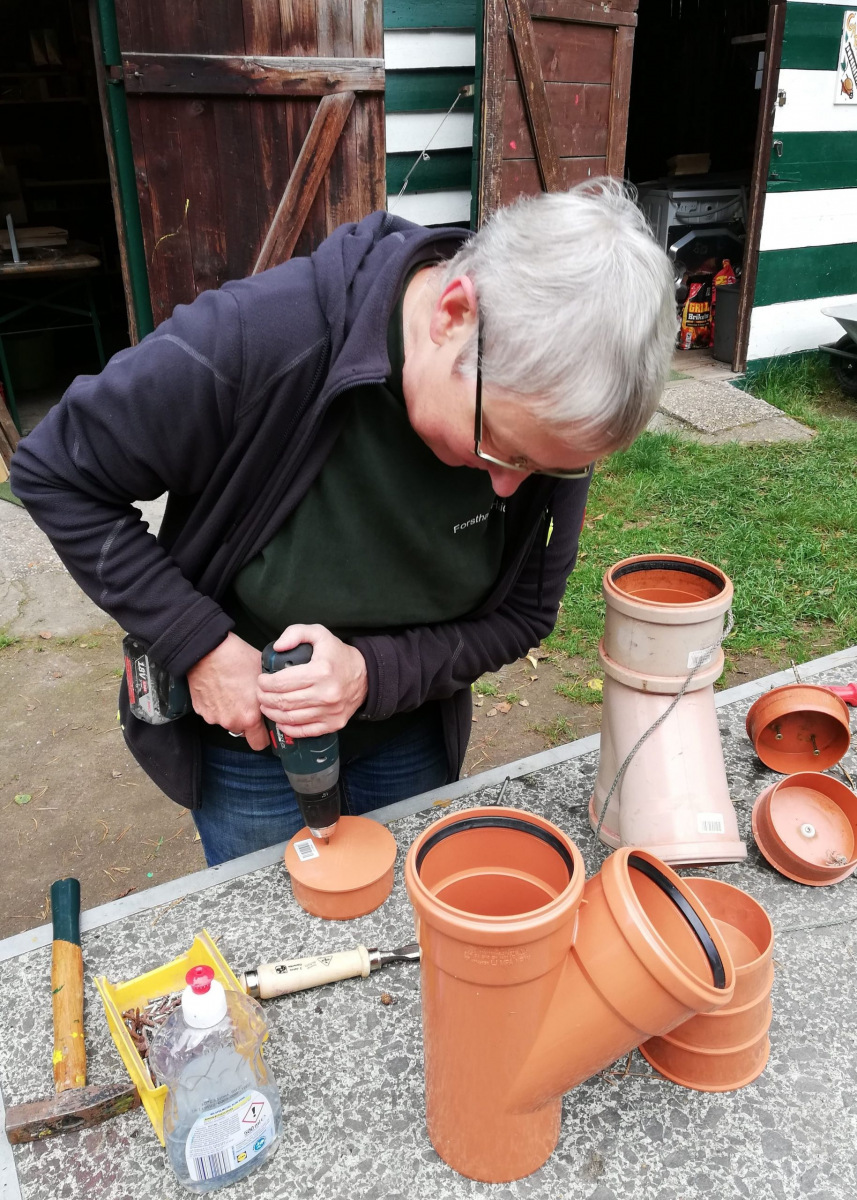 Bei bestem Arbeitswetter trafen sich 25 junge und alte Menschen, um mit ihren verschiedenen Fähigkeiten und Leidenschaften in zahlreichen Projekten das Forsthaus Stück für Stück ein bisschen schöner zu machen: mit einem neuen Steg über dem „Forschungsteich“, einem Regenwassersammel- und -verteilungssystem, der erweiterten Balancierstrecke oder reparierten Tastkästen, Bänken und Tischen.